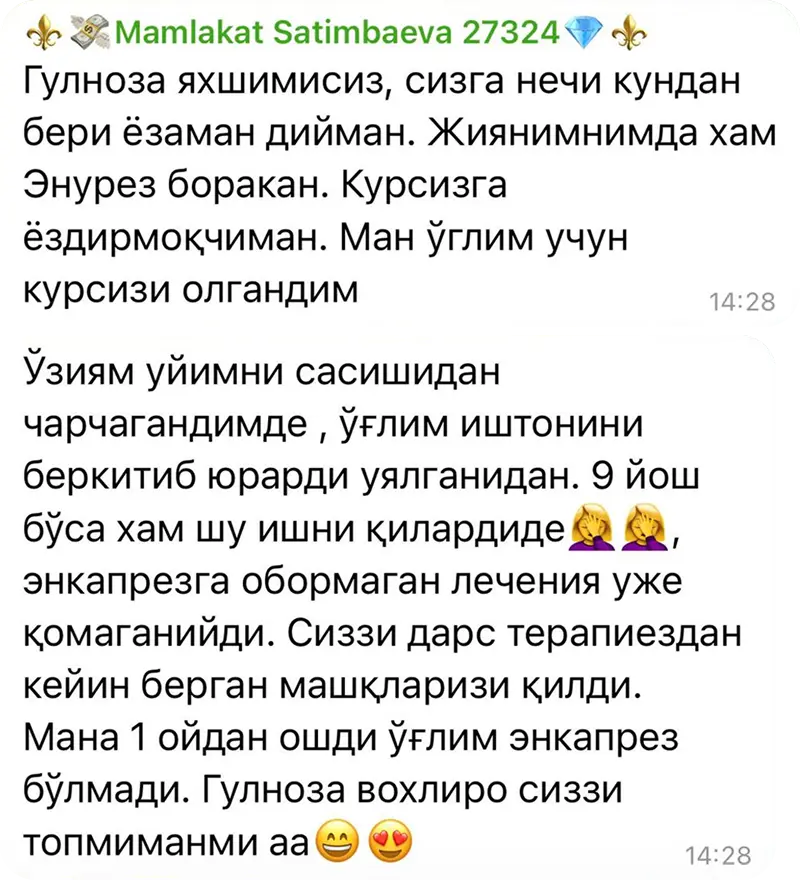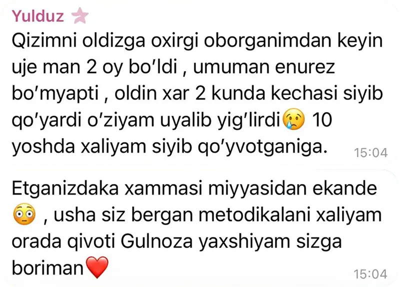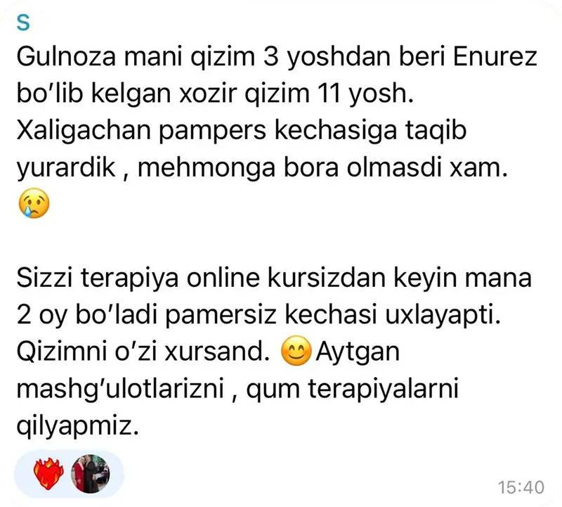 ammo, natija vaqtinchalik bo‘ldi, o‘tib enurez yana qaytalanadi.
